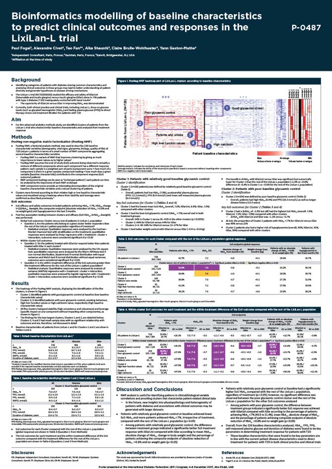 PosNeg NMF, a factorial analysis method, was used to describe 226 baseline characteristic variables (demography, vital signs, glycaemia, biology, quality of life) of 728 LixiLan-L patients in terms of a small number of NMF components aggregating several baseline characteristics variables.