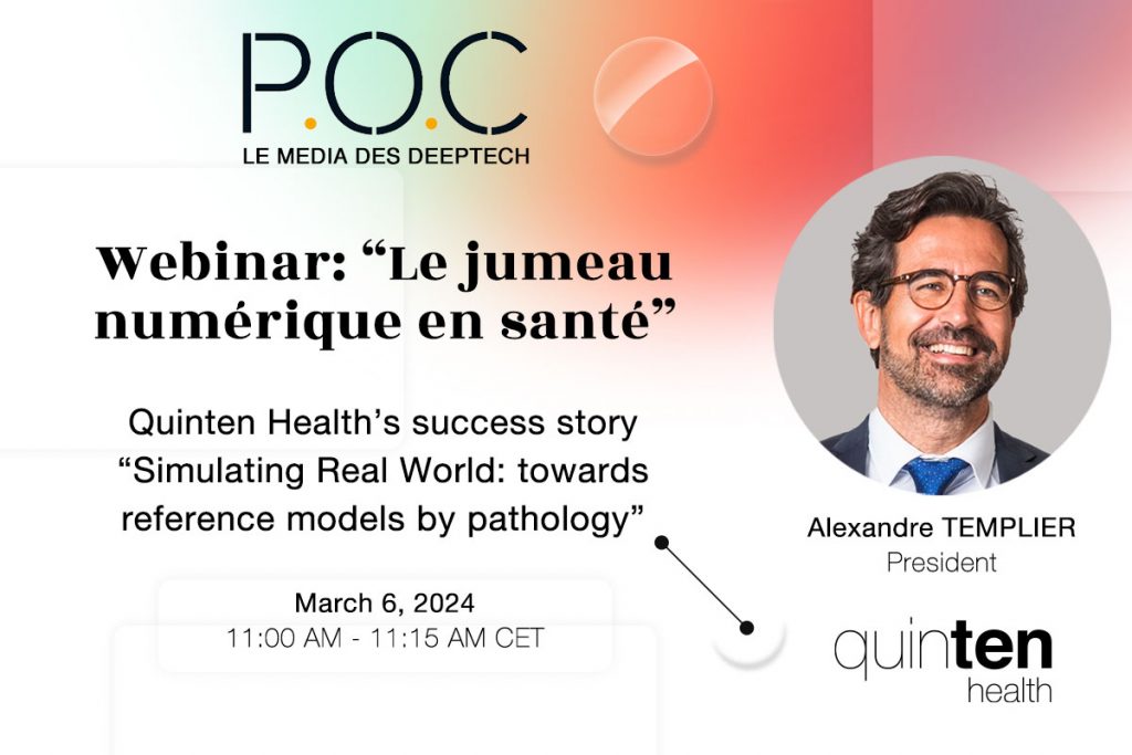 Alexandre Templier will participate at the “Le jumeau numérique en santé” webinar, organized by POC Media, a French news service specialized in Deep Tech. Alexandre Templier (President) will present Quinten Health’s success story “Simulating Real World: towards reference models by pathology” In this webinar, experts will also explore the growing importance of digital twins in […]
