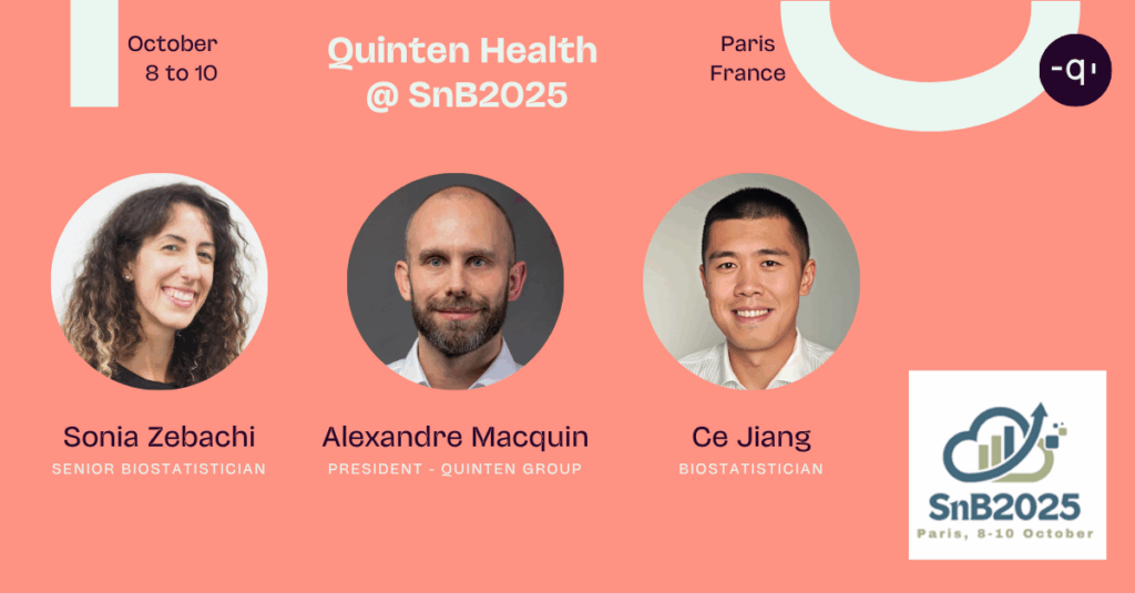 Quinten Health participated in the 10th International Meeting on Statistical Methods in Biopharmacy (SnB2025), held in Paris from October 8 to 10, 2025. Representation Quinten Health was represented by Sonia Zebachi, Alexandre Macquin and Ce Jiang, who shared the company’s vision and expertise at booth #12.Their presence reflected Quinten Health’s ongoing engagement in promoting rigorous, data-driven approaches to decision-making […]